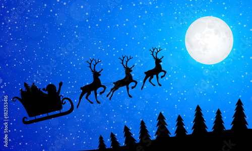 Beautiful Christmas landscape with silhouette of Santa Claus with presents and reindeer. Vector.