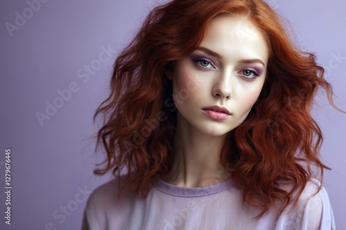 Beautiful confident photo model showcases vibrant makeup against a pastel color background in a studio setting, people and skincare, fashion theme concept.