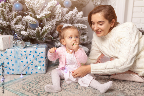 Beautiful cute little girl sitting on the floor near the New Year tree next to her mother. Holiday mood, family values, childlike spontaneity and sweet atmosphere