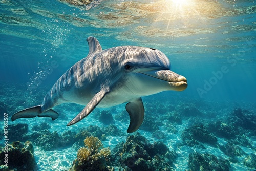 Beautiful Dolphin Swimming Gracefully in Clear Ocean Waters with Sunlight Streaming Through
