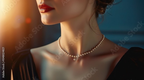 Beautiful fashion model wearing light colored elegant jewelry with black dress, jewelry focus shot
