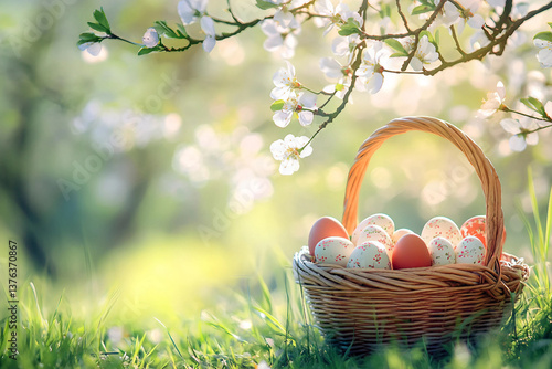 Beautiful festive Easter basket filled with colorful decorated eggs and fresh spring flowers, perfect for family celebrations, Generative AI