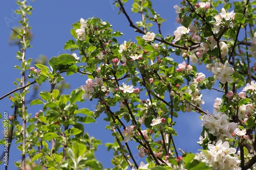 Beautiful flowers appeared on the branches of the apple tree of the spring garden.