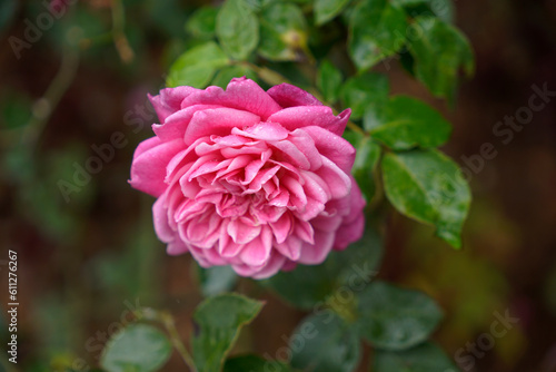 Beautiful fresh pink fully bloomed garden rose in background of green leaves