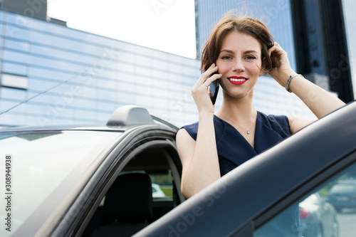 Beautiful girl in strict style of clothing gets out of the car for an important meeting in the office, goes for an interview