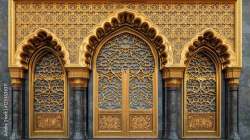 Beautiful gold Arabic window with intricate patterns, ornate door frame with Islamic arches and traditional design details
