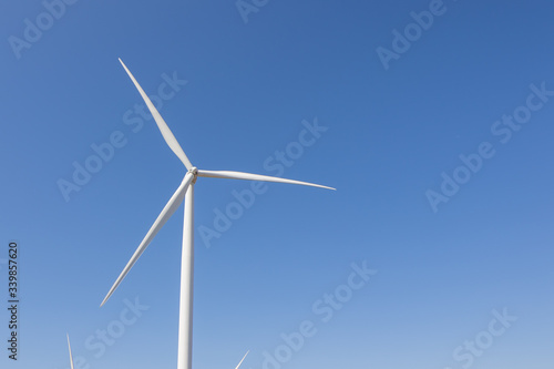 Beautiful green meadow with Wind turbines and sky generating electricity in Thailand