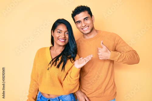 Beautiful latin young couple wearing casual clothes together showing palm hand and doing ok gesture with thumbs up, smiling happy and cheerful
