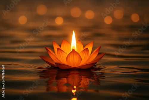 Beautiful lit candle flame inside an orange lotus flower floating on dark water at night, with a subtle reflection and bokeh lights, happy mahayana new year