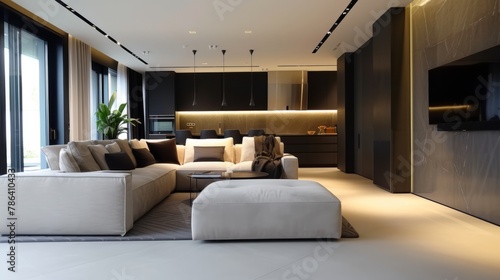 Beautiful modern minimalist living room interior with wooden floors and large floor-to-ceiling windows
