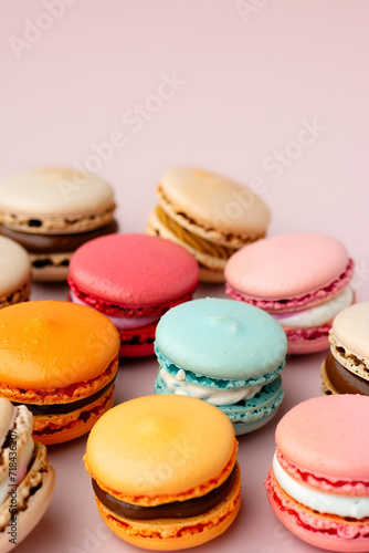 Beautiful multicolored macarons, many fillings, on a light pink background.