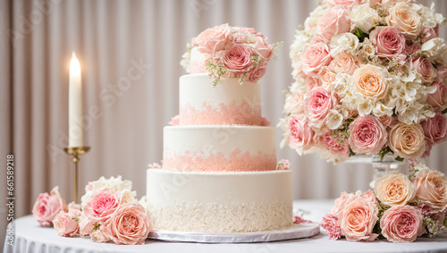 Beautiful multi-tiered wedding cake, flowers