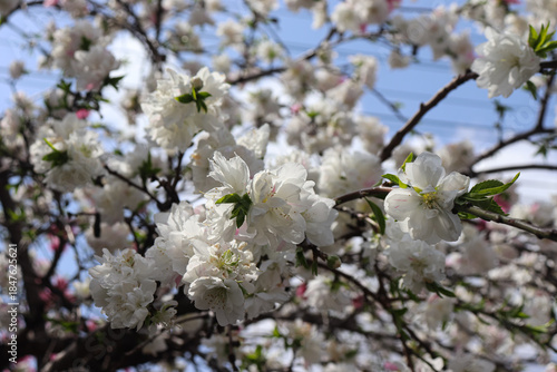 Beautiful peach blossoms blooming under a clear spring sky are the perfect visual for a seasonal floral theme.