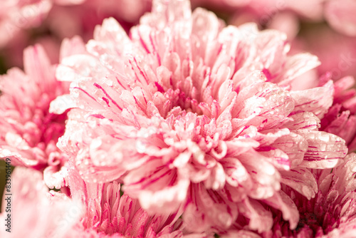 Beautiful pink chrysanthemum flowers on rustic wood, selective focus.