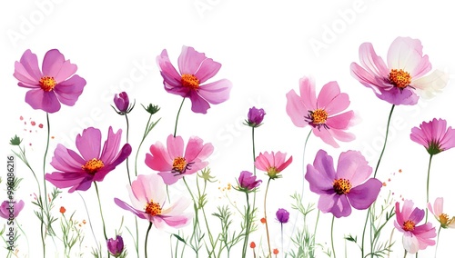 Beautiful pink cosmos flowers with a watercolor painting effect on a white background,