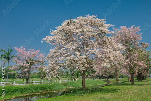 Beautiful Pink Trumpet Tree (Tabebuia Rosea) pink flower cherry blossom and fall on green grass with blue sky background. Kamphaeng Saen District, Nakhon Pathom, Thailand.