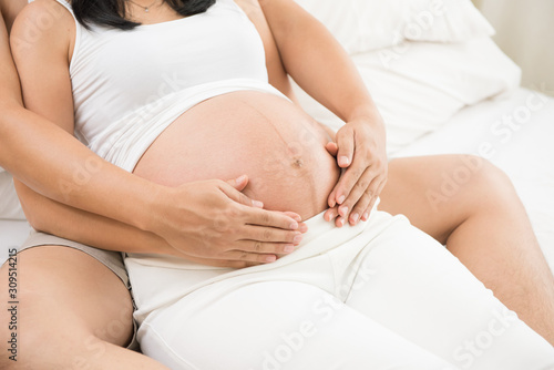 beautiful pregnant woman and her handsome husband hugging the tummy