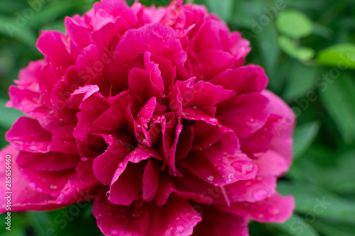 Beautiful red peony or paeony with buds and leaves
