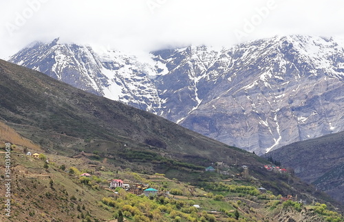 beautiful remote mountain village of lahaul valley, scenic view of snowcapped peak of himalayas, lahaul and spiti in himachal pradesh in india