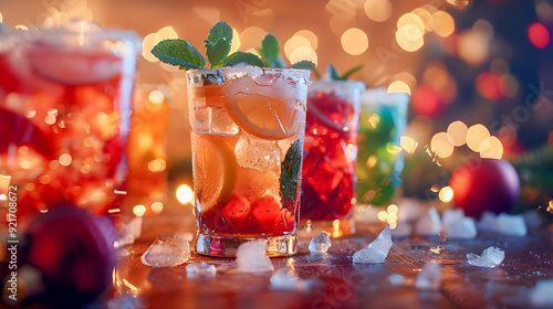 Beautiful row line of different colored alcohol cocktails with mint on a christmas party