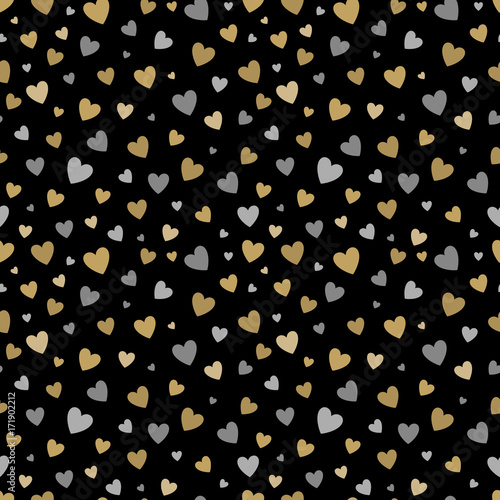 beautiful seamless pattern with gold and silver glittering hearts on black background. design for holiday greeting card and invitation of the wedding, Happy Valentine's day, birthday and mother's day.