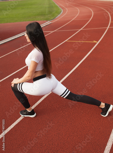 Beautiful smiling young woman, stretching on a running track