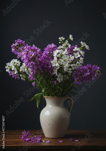 Beautiful springtime bouquet featuring vibrant purple blossoms and crisp white petals arranged elegantly in a simple ceramic vase ,white ,aster ,natural