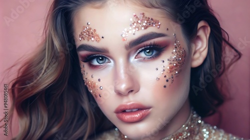 Beautiful Stylish Young Woman With Glitter Makeup Posing Isolated on Coral