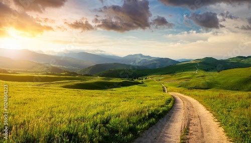 beautiful summer mountain rural landscape panorama of summer green field with dirt road and sunset cloudy sky