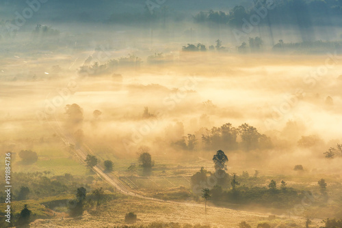 Beautiful sunrise scene with misty and tree in morning in forest valley in khao kor mountain