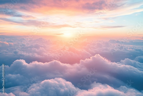 Beautiful sunset sky above clouds with dramatic light. Cabin view from airplane, ai