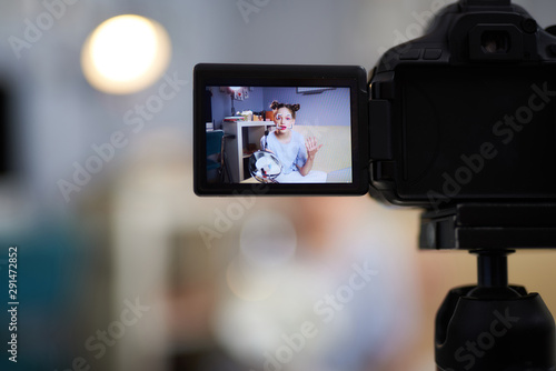Beautiful teenage girl recording makeup tutorial at home