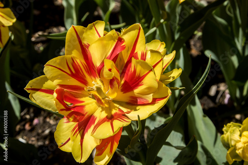 Beautiful tulip blooming opens spring time garden park