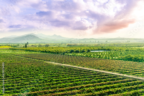 beautiful view in a green farm field with rows of rural plants and vegetables with amazing sunset or sunrise on background of agricultural landscape