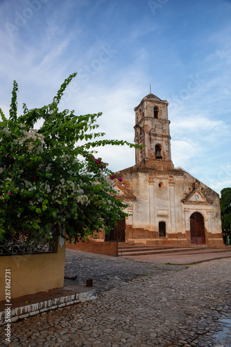 Beautiful View of a Church in a small touristic Cuban Town during a vibrant sunny and cloudy evening before sunset. Taken in Trinidad, Cuba.