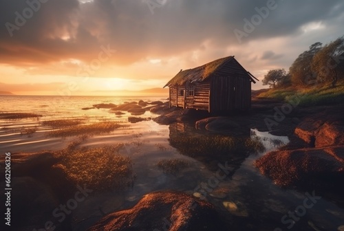 beautiful view of the hut on the beach with sunset in the evening. generative ai