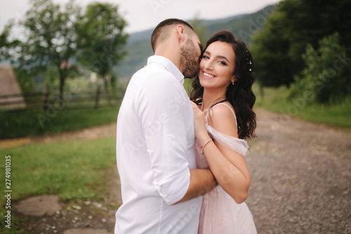 Beautiful wedding couple in Carpathian mountains. Handsome man with attractive woman