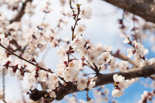 Beautiful white blossom cherry tree spring day on a background of blue sky, sunshine, Macro
