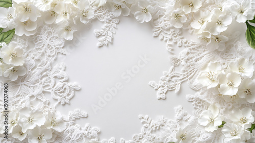 Beautiful white flowers and lace on the right side of an empty space for text or decoration