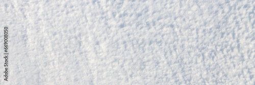 Beautiful winter background with snowy ground. Natural snow texture. Wind sculpted patterns on snow surface. Wide panoramic texture for background and design.