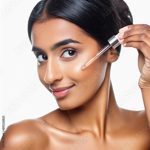 Beautiful Woman holding a Pipette with Skincare Serum - Applying Serum to her Face - Hyaluronic Acid, Anti Aging, Moisturiser, Repair, Hydrating, Vitamin, Ascorbic, Retinol, Exfoliant, Azelaic