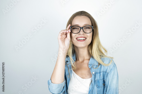 beautiful woman holding hand near glasses smiling isolated white background