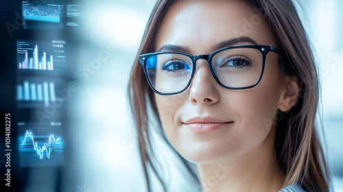 Beautiful woman in glasses, business-style portrait, hologram of data and code floating around her head, blurred background with a window,