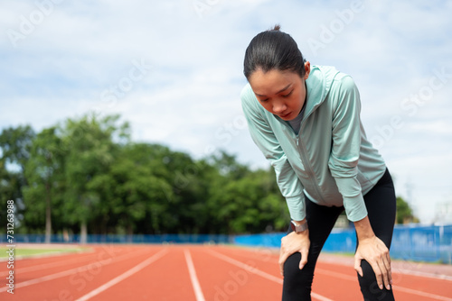 Beautiful woman tired during jogging on running track. Young asian female intense training workout challenge breathing exhausted. Exercise in the morning. Healthy and active lifestyle concept.