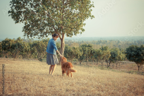 Beautiful woman with a cute golden retriever dog