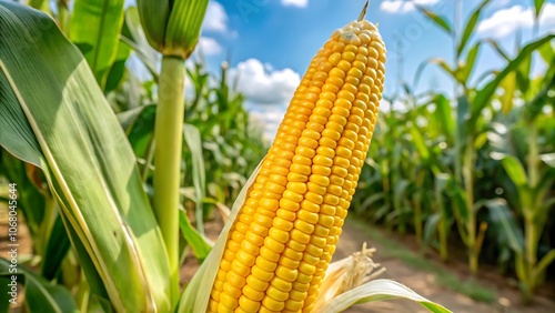 Beautiful yellow ear of corn in a corn plantation field, fresh and vibrant, agriculture, farm, crop, harvest, agriculture, rural, JPG, AI GENERATED