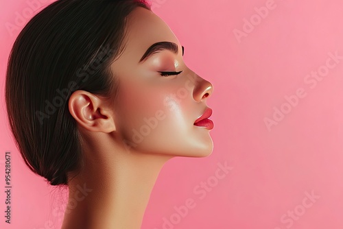 Beautiful young adult woman in profile with healthy shiny skin. Photo of gorgeous girl after morning beauty cosmetic routine finishes daily makeup on pink background. Youth and skin care concept , ai