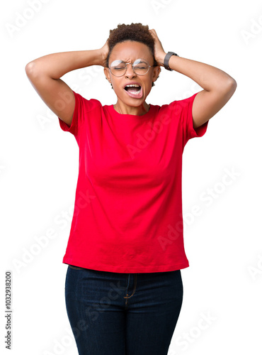 Beautiful young african american woman wearing glasses over isolated background Crazy and scared with hands on head, afraid and surprised of shock with open mouth