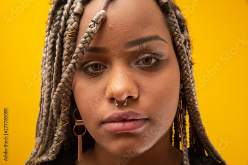 Beautiful young african american woman with dread hair on yellow background