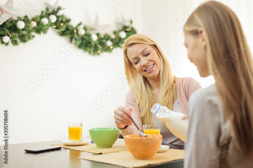 Beautiful young blond-haired woman pouring milk into bowl with breakfast cereals. Mother and teenage daughter eating breakfast at home. Christmas decorations in the background